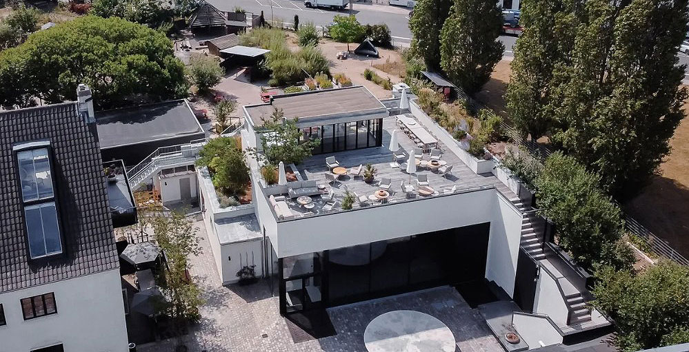 Ved firmafester afvikles middagen typisk i garagen som ligger under tagterrassen og efterfølgende kan festen fortsætte på tagterrassen.